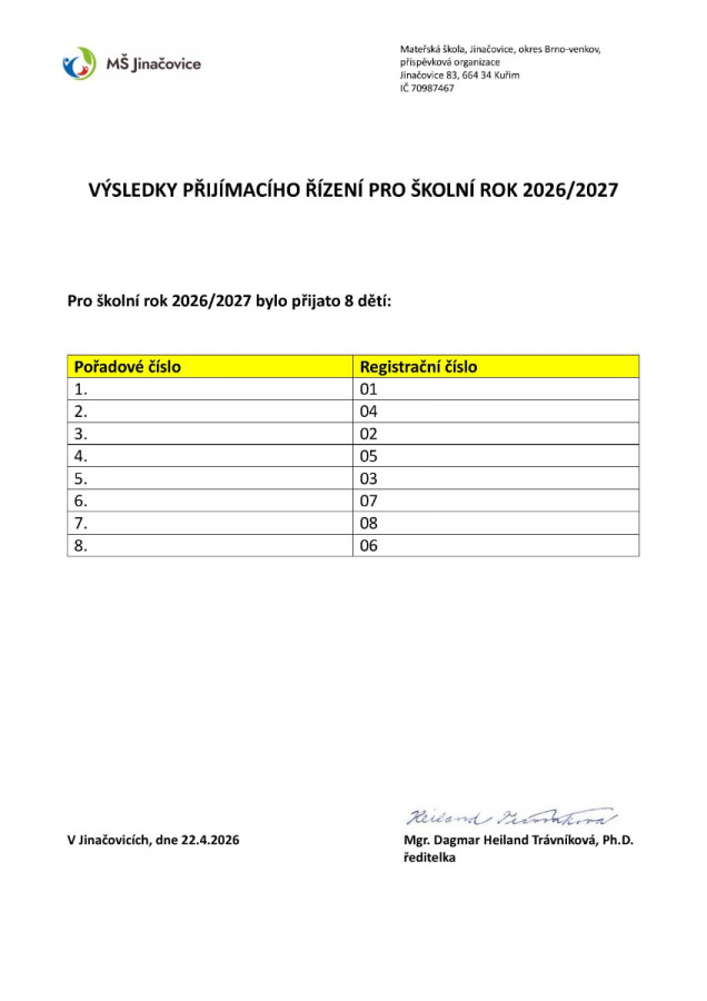 Pro školní rok 2026/2027 bylo v MŠ Jinačovice uvolněno 12 míst. Výsledky najdete v přiložené tabulce pod přiděleným registračním číslem.